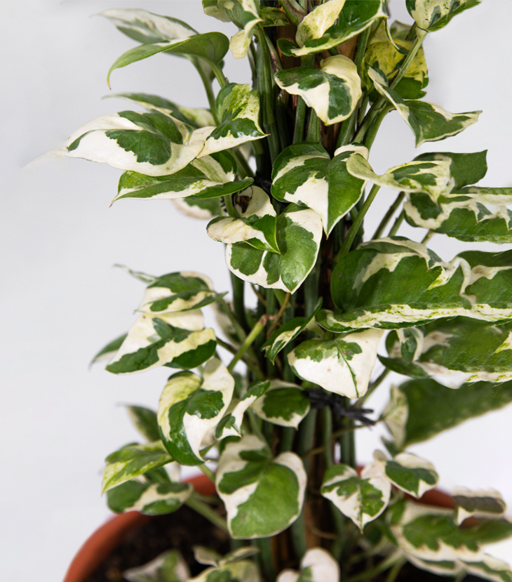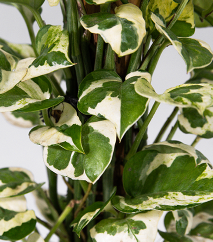El Pothos N’Joy en tótem es una versión espectacular de este apreciado cultivar, entrenado para crecer de forma vertical y destacar su elegante variegación blanca y verde. Aunque de manera natural es más compacto y de crecimiento más lento que otros pothos, al cultivarse sobre un soporte se estimula el anclaje de sus raíces aéreas, lo que con el tiempo puede dar lugar a hojas de mayor tamaño y a una apariencia más robusta y frondosa.
