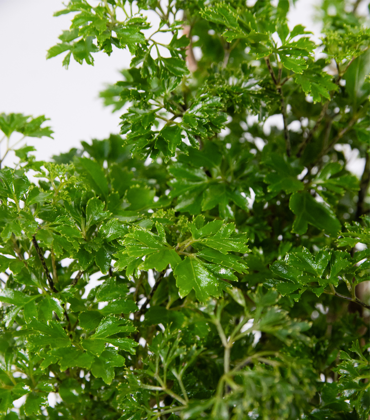 Nombre científico es Polyscias fruticosa 'Elegans' (también conocida como Aralia Rizada o Aralia Ming 'Elegans'), es una popular planta de interior tropical valorada por su distintivo follaje finamente dividido que recuerda al perejil, sus cualidades como purificador de aire, y su crecimiento lento, lo que la hace ideal para macetas y espacios interiores. Es una planta de dificultad media en cuanto a cuidados, no recomendada para principiantes debido a sus requerimientos específicos de humedad y riego.