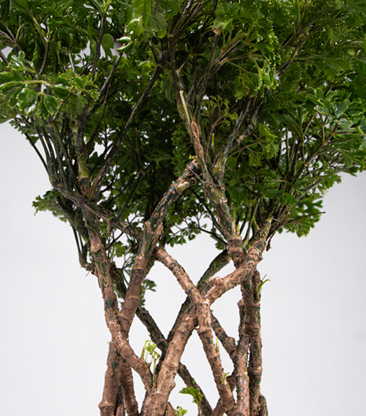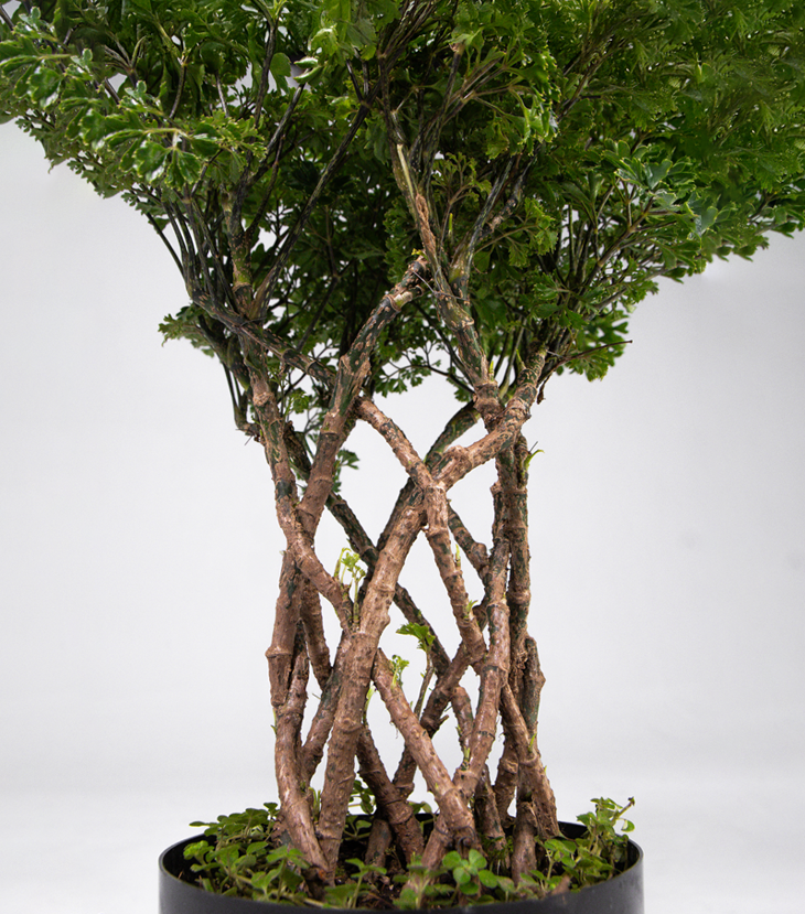 Presenta hojas perennes, lobuladas, algo brillantes y de color verde vivo, dispuestas en una forma densa y aireada. Suelen crecer sobre tallos leñosos, lo que le da un aspecto de árbol en miniatura o bonsái.