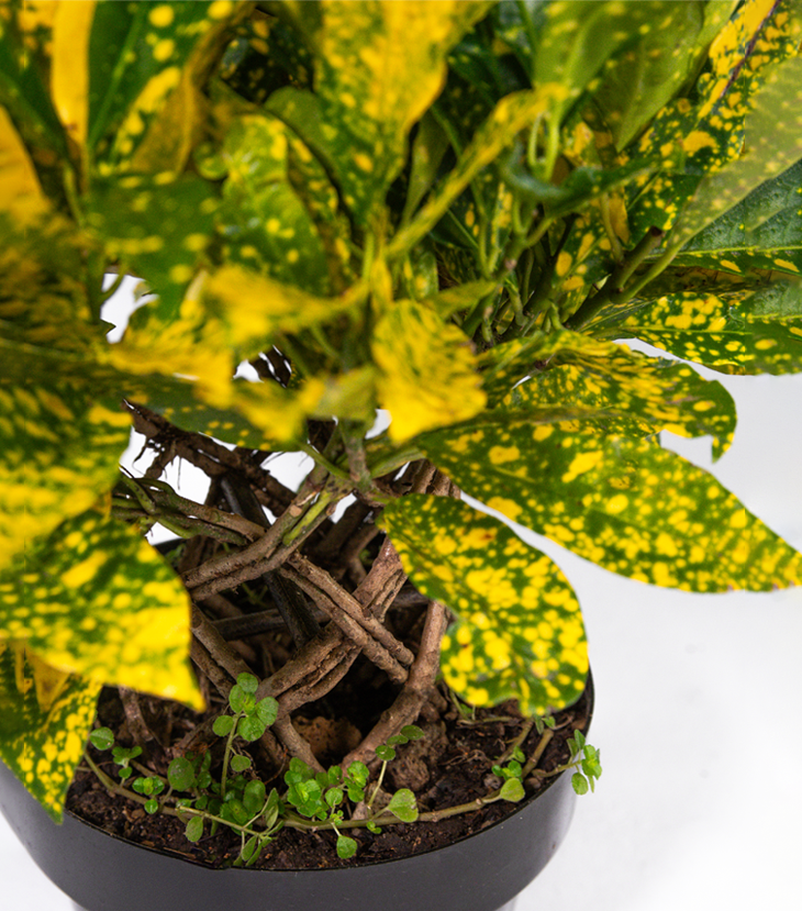 Tiene hojas pequeñas a medianas decoradas con llamativos puntos amarillos que parecen salpicaduras de oro. Su forma compacta la hace perfecta para aportar color y vida a cualquier espacio.